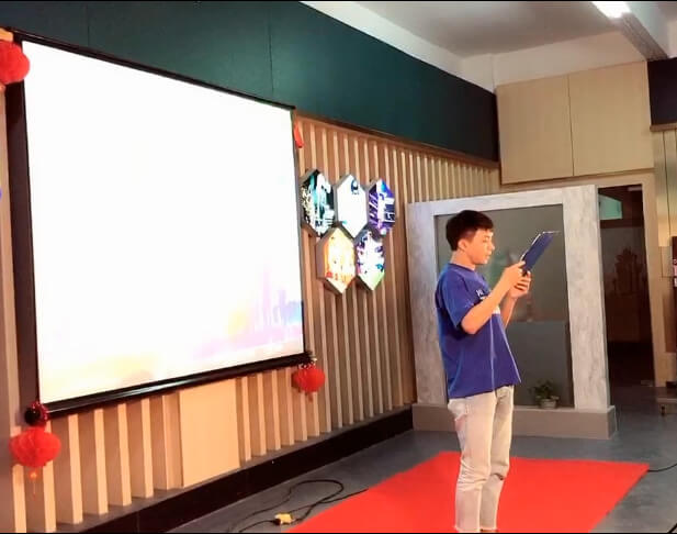 2019年5月4日。19:00一切準(zhǔn)備就緒,精彩的朗讀比賽在歡快激昂的音樂(lè)聲中開(kāi)幕了!一段運(yùn)動(dòng)進(jìn)行曲,把全場(chǎng)的氣氛瞬間活躍了起來(lái)。選手們個(gè)個(gè)摩拳擦掌,躍躍欲試。主持人開(kāi)場(chǎng)后由公司最高層領(lǐng)導(dǎo)致辭,并宣布比賽開(kāi)始。并進(jìn)入第一個(gè)環(huán)節(jié)。23組選手紛紛抽簽按順序準(zhǔn)備上臺(tái)表演。第一位出場(chǎng)的朗讀者是谷樹(shù)平,演講內(nèi)容積極向上、聲音洪亮、娓娓動(dòng)聽(tīng)、引人入勝,拉開(kāi)了朗讀賽的序幕。伴隨著陣陣的掌聲的起落,很快輪到了五號(hào)選手。譚冰冰上臺(tái)演講了,只聞一段振奮人心的背景音樂(lè)一響起,便把朗讀演講的氣勢(shì)帶上了較高的一個(gè)層次,同時(shí)配上抑揚(yáng)頓挫、高亢激昂的演講聲贏得了評(píng)委及觀眾的陣陣掌聲。接下來(lái)的六號(hào)選手朱運(yùn)強(qiáng)以及十號(hào)選手梁偉海,同樣用振振有詞、激奮人心的演講打動(dòng)了評(píng)委和觀眾,讓高潮迭起,一浪高一浪,同樣贏得了現(xiàn)場(chǎng)評(píng)委和觀眾的陣陣掌聲。最后在23號(hào)雙人選手,吳素漫和鄧紹云的中英雙語(yǔ),完美結(jié)合的朗讀聲中結(jié)束了。