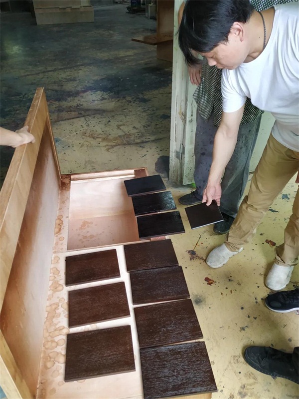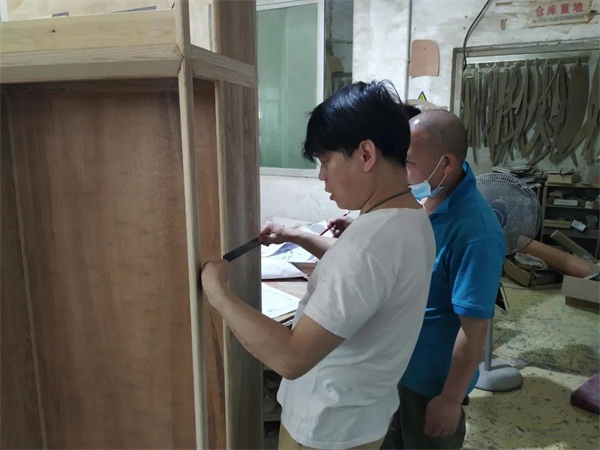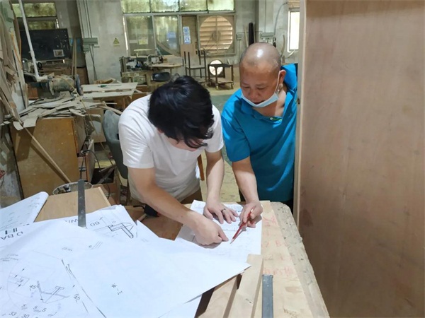 反復丈量樣品尺寸,反復對比設計圖,從尺寸、功能,到顏色,嚴格按照圖紙設計、生產(chǎn)。設計師與生產(chǎn)車間的師傅反復溝通確認,精準把控矩形展柜的尺寸,不能太高,拿放不方便,影響使用效率,但若太矮,又失去了高端大氣之感。他說,失之毫厘謬以千里,所以1毫米都不能放過。